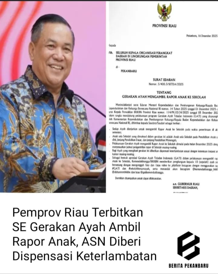 Adapun surat tentang Gerakan Ayah Mengambil Rapor Anak ke Sekolah itu menindaklanjuti surat Edaran Menteri Kependudukan dan Pembangunan Keluarga/Kepala Badan Kependudukan dan Keluarga Berencana Nasional RI nomor. 14 Tahun 2025 tanggal 01 Desember 2025 dan surat Kepala Perwakilan BKKBN Provinsi Riau nomor. 114/PK.02/14/2025 tanggal 05 Desember 2025.