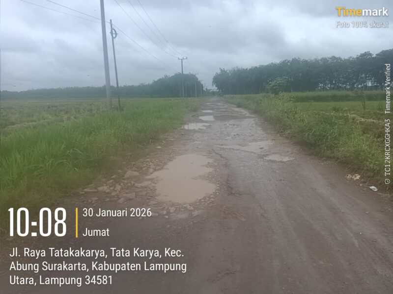 Lampung Utara, cyberxpost.com – Saat ini kondisi jalan kabupaten antar Desa banyak yang sudah rusak, Kali ini jalan peng hubung antar Desa, dari Kabupaten Kotabumi Lampung Utara menuju Desa Tata Karya Abung Surakarta, Menuju Desa Sukoharjo, Desa Bumi Restu, Desa Bumi Jaya dan Desa Rejo Mulyo, saat ini kondisinya sudah banyak yang rusak sudah banyak yang berlobang.