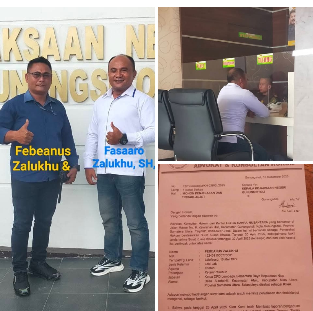 Fasaaro Zalukhu,SH dalam surat tersebut bertindak sebagai Penasehat Hukum berdasarkan Surat Kuasa Khusus Tanggal 30 April 2025, yang di tanda tangani oleh Ketua DPD Lembaga Gemantara Raya Kepulauan Nias Febeanus Zalukhu.