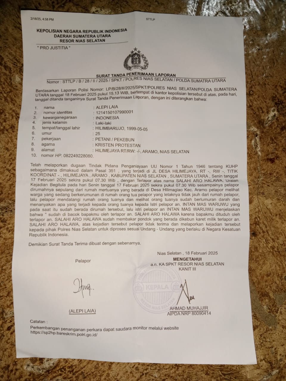 Laporan penganiayaan ini, diterima Polres Nias selatan dengan Nomor: STPL / B /28 / II /2025 / SPKT / POLRES NIAS SELATAN / POLDA SUMTRA UTARA tanggal 18 Feb 2025.