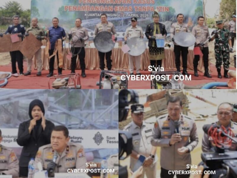 Kuantan Sengingi | ᴄʏʙᴇʀxᴘᴏꜱᴛ.ᴄᴏᴍ – Wakapolda Riau Brigjen Hengki Haryadi memimpin langsung jumpa pers pengungkapan kasus Pertambangan Emas Tanpa Izin (PETI) di wilayah hukum Polres Kuantan Singingi, Kamis (23/4/2026).
