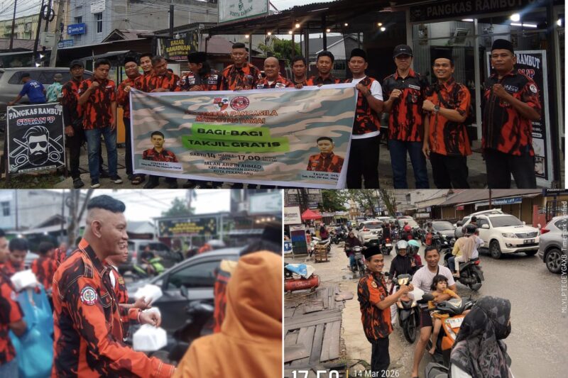 PEKANBARU | CYBERXPOST.com – Dalam rangka menyemarakkan bulan suci Ramadhan serta menumbuhkan semangat kepedulian sosial kepada masyarakat, Pimpinan Anak Cabang (PAC) Pemuda Pancasila Kecamatan Marpoyan Damai menggelar kegiatan berbagi takjil kepada masyarakat dan para pengguna jalan.