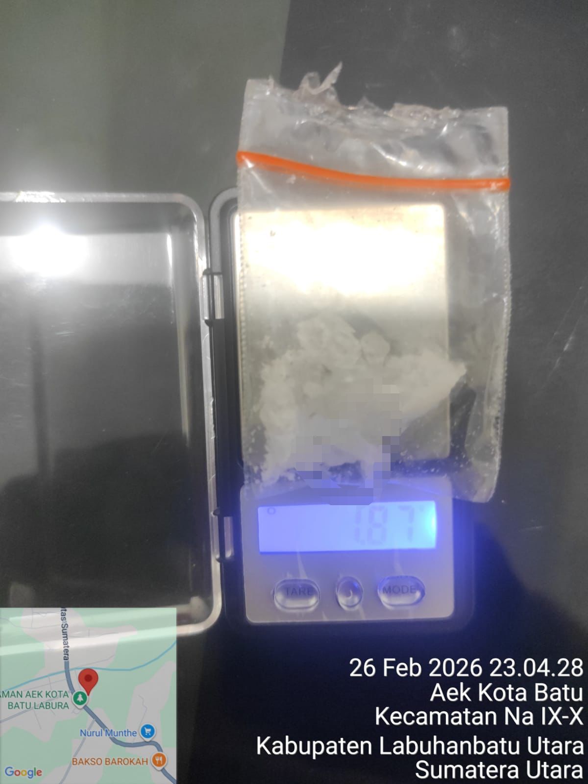 Dalam pengungkapan tersebut, petugas mengamankan seorang laki-laki berinisial A.S.S. (27), warga Lingkungan V Purwosari, Kelurahan Aek Kota Batu, yang diduga kuat terlibat dalam penyalahgunaan narkotika. Dari tangan pelaku, polisi menyita barang bukti berupa satu plastik klip ukuran sedang yang berisi narkotika jenis sabu dengan berat bruto 1,87 gram serta satu buah mancis yang digunakan sebagai alat bantu.
