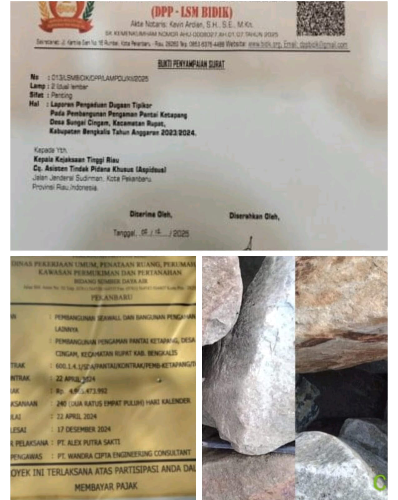 PekanbaruRiau | cyberxpost.com – Dewan Pimpinan Pusat Lembaga Swadaya Masyarakat Barisan Intelektual Demokrasi dan Keadilan (DPP-LSM BIDIK) secara resmi mengajukan laporan pengaduan dugaan Tindak Pidana Korupsi (Tipikor) kepada Kejaksaan Tinggi (Kejati) Riau. Laporan ini berkaitan dengan proyek Pembangunan Pengaman Pantai Ketapang di Desa Sungai Cingam, Kecamatan Rupat, Kabupaten Bengkalis, yang dilaksanakan selama dua tahun anggaran, yaitu 2023 dan 2024