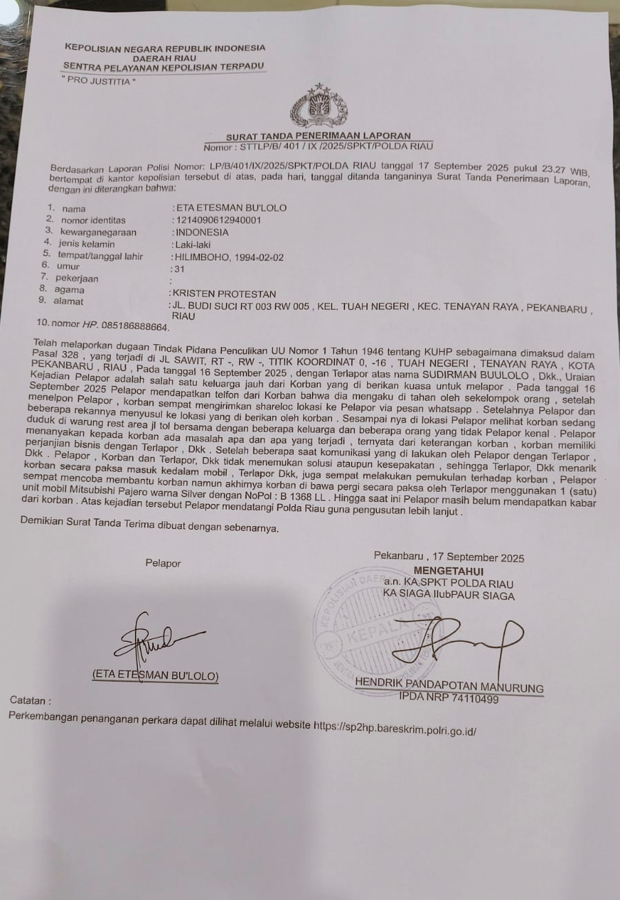 “Dan telah dilaporkan peristiwa dugaan Tindak Pidana Penculikan tersebut sesuai UU Nomor 1 Tahun 1946 tentang KUHP sebagaimana dimaksud dalam Pasal 328, yang terjadi di Jl. Sawit RT, RW, – Titik Koordinat 0, – 16, Tuah Negeri Tenayan Raya Kota Pekanbaru Riau.